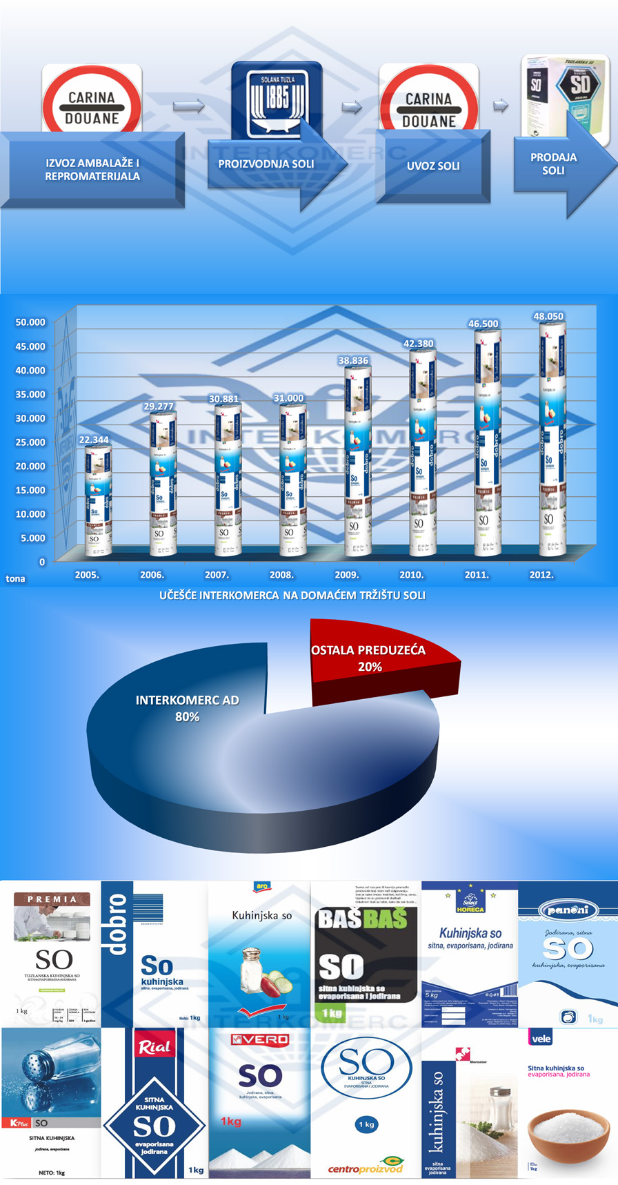 Direkcija soli – Interkomerc AD je generalni zastupnik i distributer tuzlanske soli koja se proizvodi u Solani Tuzla. Svih prethodnih godina ostvarivan je uzlazni trend prodaje kuhinjske soli tako da smo u 2010.godini ostvarili učešće u prodaji kuhinjske soli na tržištu Srbije od preko 80 %. Glavni razlog ovako uspešne pozicioniranosti soli na tržištu Srbije leži u činjenici da je Interkomerc od 2005.godinepreuzeo i finansiranje proizvodnje u Solani Tuzla čime su izbegnute sve eventualne nepoželjne okolnosti . Koncept finansiranja proizvodnje dobio je svoju pozitivnu potvrdu .Pored uvoza gotovih proizvoda iz Solane Tuzla i Solane Pag , Direkcija soli u Interkomercu razvila je i izradu robnih marki u pogonima u Vršcu . I ovde je Interkomerc primenio isti model finansiranja proizvodnje.Interkomerc pakuje soli i začine za sve značajnije trgovinske lance u Srbiji (Delta, Univerexport , Metro , Dis ,Idea,Gomex, Veropulos ... ) |